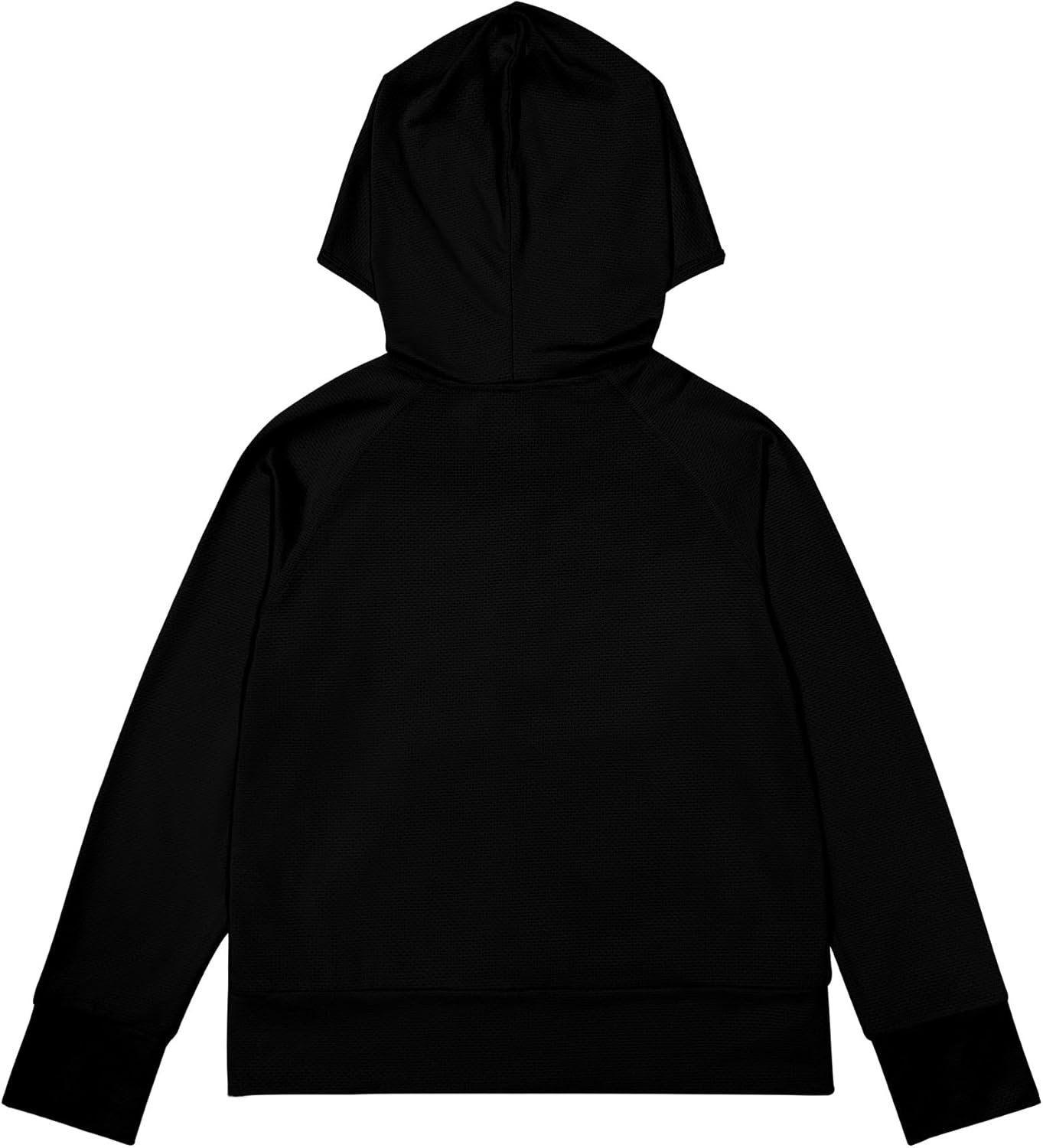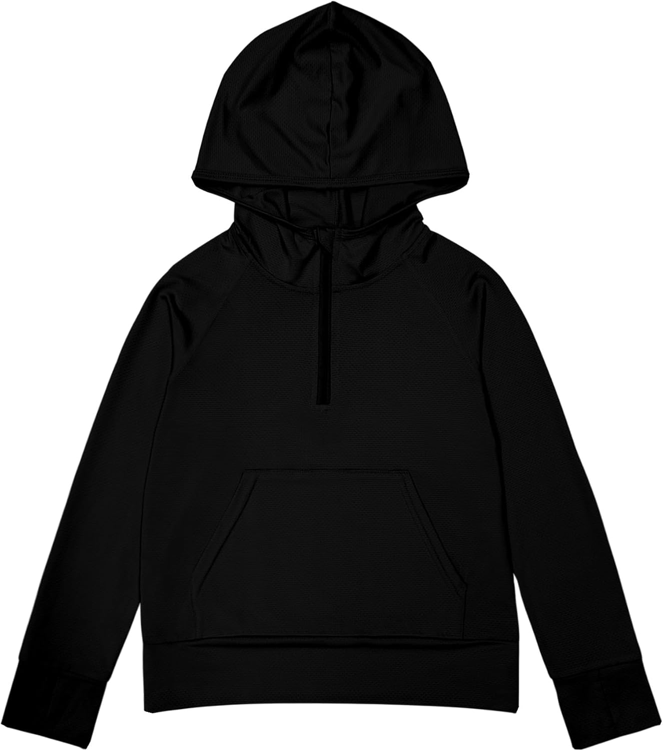 Design Feature: Long sleeve athletic jacket with thumbholes and hood for extend coverage, easy-wear front half-zip closure, front pouch pocket.