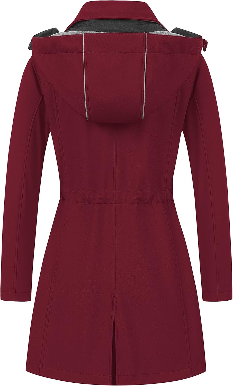 ⭐Windproof Warm Jacket: The tight weave and water-repellent durable fabric.Lined with polar fleece to be extra soft and skin-friendly.The length keep me plenty warm and comfortable.Blocks the wind and isn’t too warm while being active.This softshell long jacket with reflective strip detachable hood(keep you well protected in rainy and windy day)